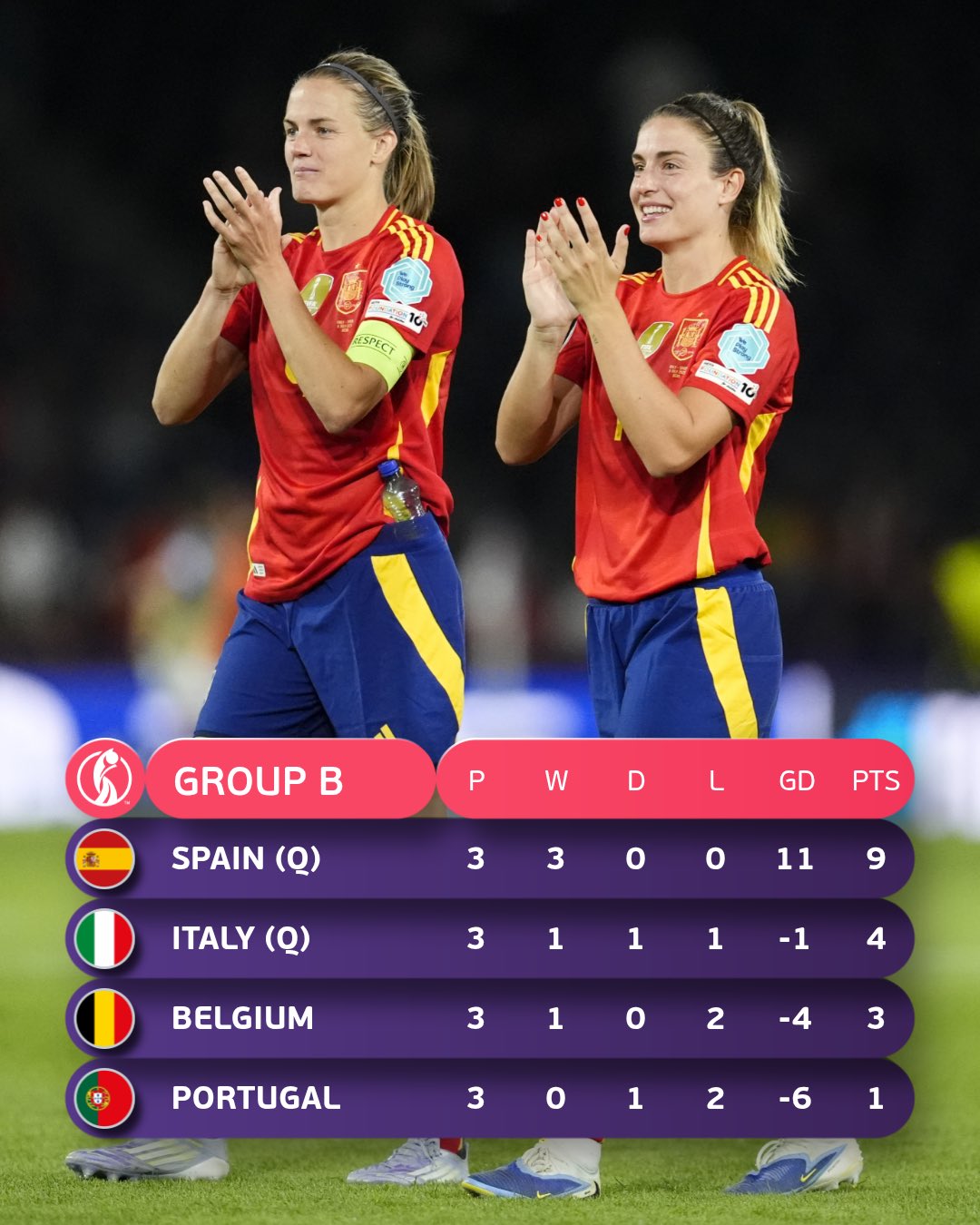 इन्ज्युरी समयको पहिलो मिनेटमा पुटेलासको अर्को असिस्टमा गोन्जालेजले नजिकबाट गोल गर्दै स्पेनको जित पक्का गरिन् । क्वाटरफाइनलमा स्पेनले आयोजक स्विट्जरल्यान्डको तथा इटालीले नर्वेसँग खेल्नेछ।