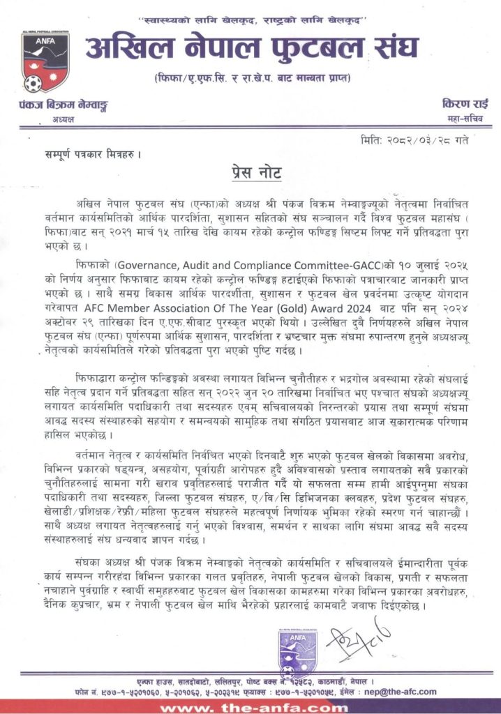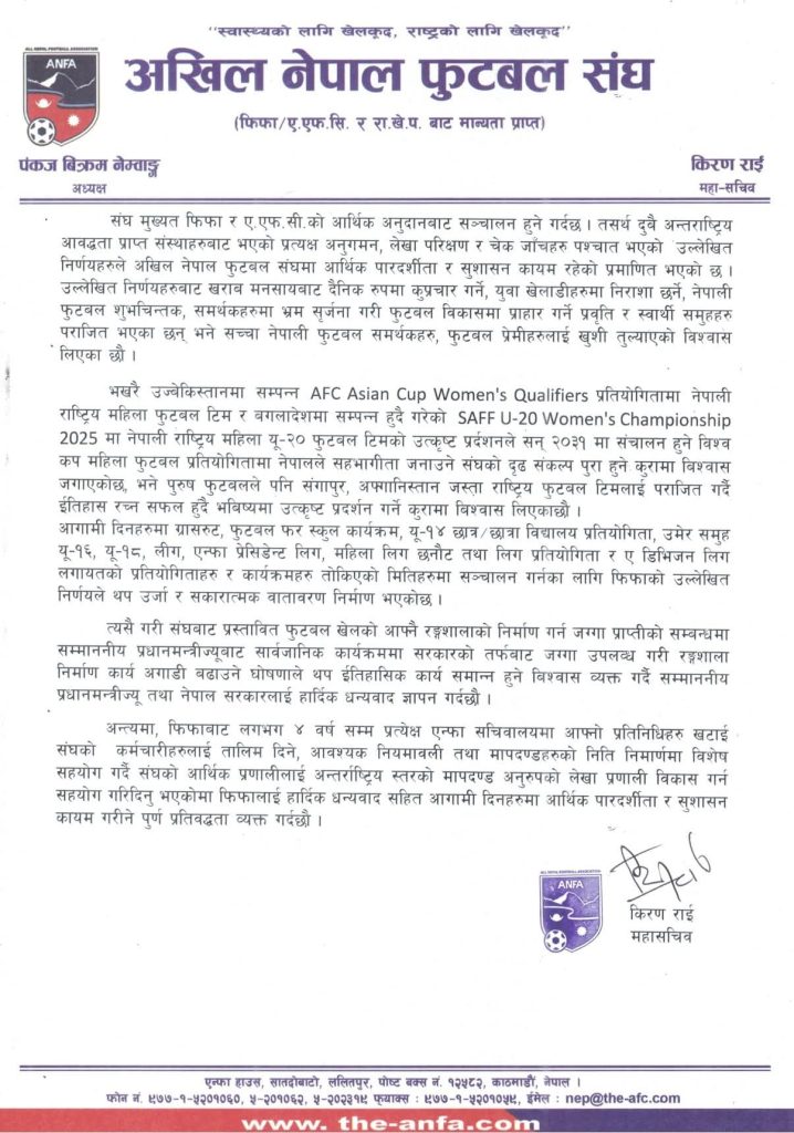 संघ मुख्यत फिफा र ए.एफ.सी. को आर्थिक अनुदानबाट सञ्चालन हुने गर्दछ । तसर्थ दुवै अन्तराष्ट्रिय आबद्धता प्राप्त संस्थाहरुबाट भएको प्रत्यक्ष अनुगमन, लेखा परिक्षण र चेक जाँचहरु पश्चात भएको उल्लेखित निर्णयहरुले एन्फामा आर्थिक पारदर्शीता र सुशासन कायम रहेको प्रमाणित भएको छ, विज्ञप्तिमा भनिएको छ।
