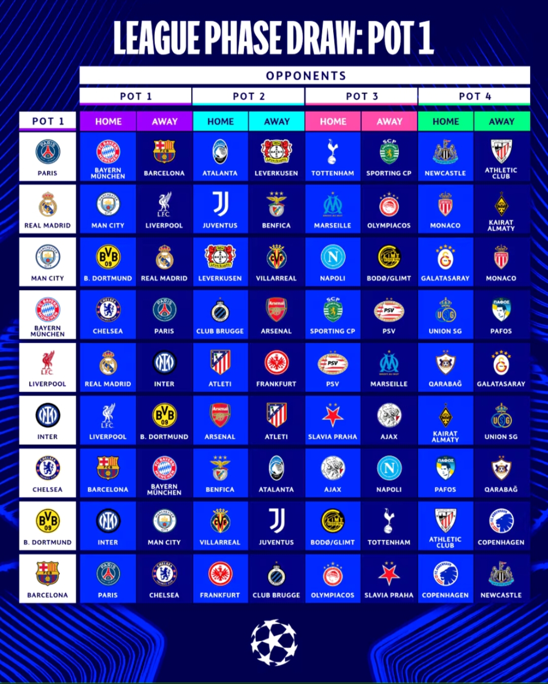 लिभरपुलले रियलसँगै खेल्नुका साथै, एट्लेटिको माड्रिड र गत सिजनको उपविजेता इन्टर मिलानसँग पनि खेल्नेछ। पेप गार्डियोलाको म्यानचेस्टर सिटीले नापोली र बोरुसिया डर्टमुन्डसँग भिड्नेछ।