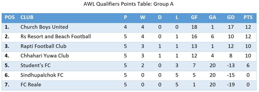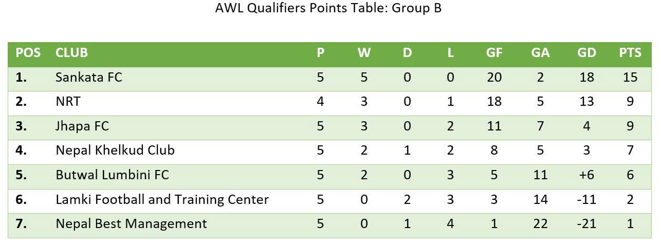 संकटाले ग्रुप ‘बी’ को शीर्षस्थानमा छ। ४ खेल खेलेको एनआरटी र ५ खेल खेलेको झापा एफसीसँग समान ९ अंक छ। संकटाले आफ्नो अन्तिम खेल एनआरटीसँग खेल्नेछ। संकटा अघिल्लो सिजन रेलिगेसनमा परेको थियो।