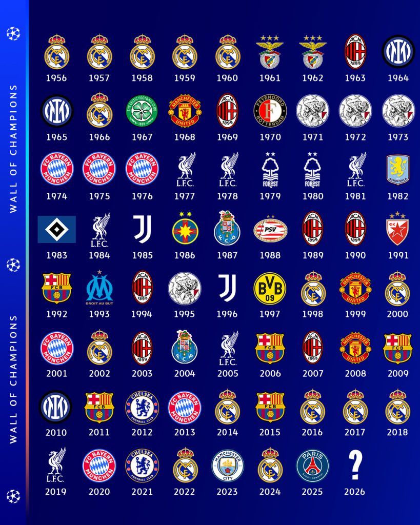 च्याम्पियन्स लिग (पूर्व युरोपियन कप) सन् १९५५ मा सुरु भएदेखि थोरै क्लबले मात्र लगातार उपाधि जितेका छन्।