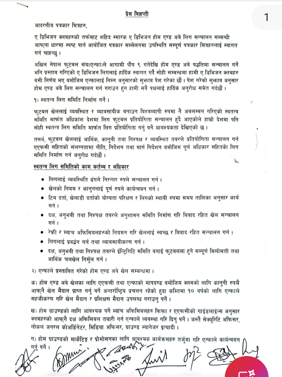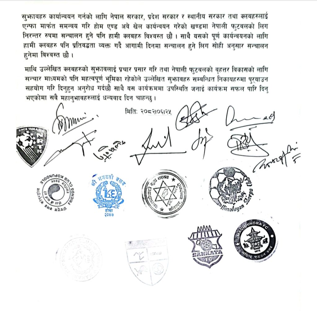 संयुक्त प्रेस विज्ञप्तिमा ए डिभिजनका १४ क्लब मध्ये ३ विभागीय टोली (नेपाल पुलिस क्लब, त्रिभुवन आर्मी फुटबल क्लब र एपिएफ फुटबल क्लब) तथा जावलाखेल युथ क्लब र प्लानिङ ब्वाइज युनाइटेडका प्रतिनिधिको हस्ताक्षर छैन। विभागीय टोलीको यस्ता कुनै पनि गतिविधिमा यसअघि पनि सहभागिता रहदैन थियो।