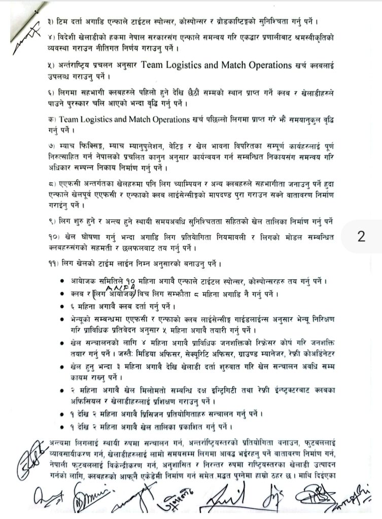 क्लबहरुले विश्व फुटबलको संरचनाजस्तै स्वतन्त्र र सबल लिग समिति गठन गर्न पनि माग गरे। त्यसैगरी क्लबहरुले एन्फालाई प्रायोजक र प्रसारणलाई लिग सुरु हुनुभन्दा १० महिना अघि नै टुङ्गाउने, क्लब-एन्फा सम्झौता ८ महिना अघि गर्न, क्लब दर्ता ६ महिना अघि पूरा गर्न, मैदान निर्धारण तथा निरीक्षण ५ महिना अघि गर्न, खेलाडी दर्ता ३ महिना अघि गर्न तथा लिग सुरु हुनुभन्दा एक वा दुई महिना अघि प्रि-सिजन प्रतियोगिता आयोजना गर्न पनि सुझाव दिएका छन्।