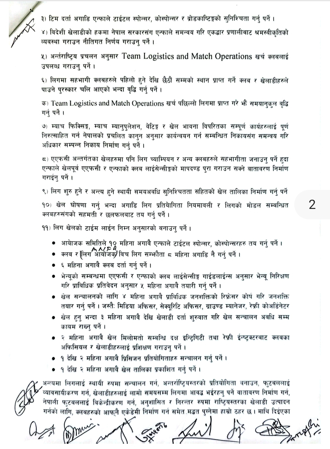 बैठकको अघिल्लो दिन शनिवार पत्रकार सम्मेलनमार्फत एन्फालाई एएफसी क्लब लाइसेन्स सुनिश्चित गर्न र लिग सुरु हुनुअघि क्लबहरूलाई दीर्घकालीन लिजमा होम ग्राउन्ड उपलब्ध गराउन मागसहितको सुझाव क्लबले प्रस्तावका रुपमा अघि सरेको हो ।