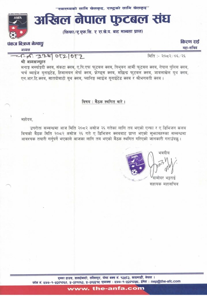एन्फा र क्लबबीच लिगको लागि यसअघिको यसअघि बैठक जेन जी प्रर्दशनपछि उत्पन्न परिस्थितिका कारण स्थगित भएको थियो।
