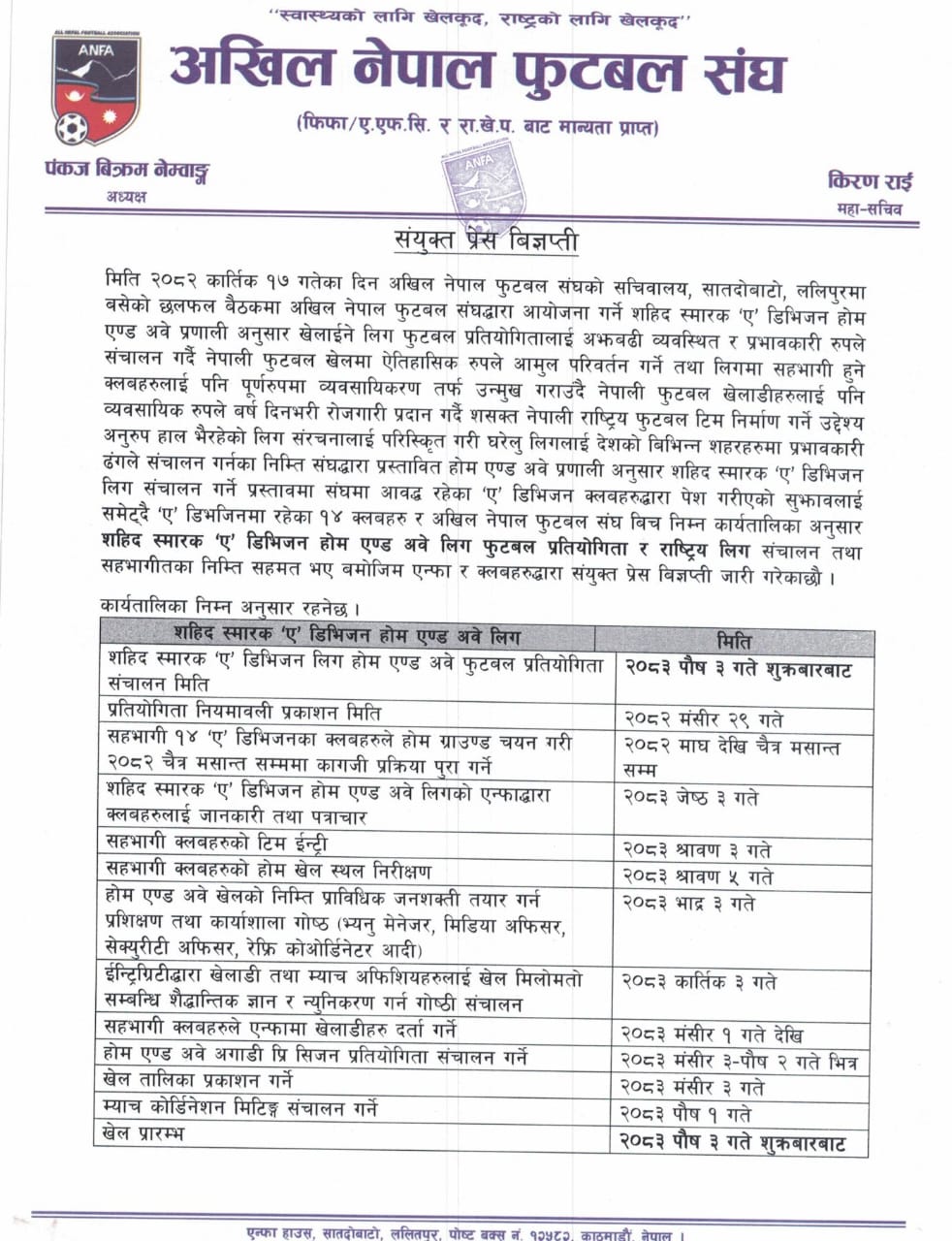 राष्ट्रिय लिगलाई प्राथमिकतामा राख्दै एन्फा र क्लबहरुबीच सहिद स्मारक ‘ए’ डिभिजन लिग भने २०८३ सालको पुस ३ गते हुने सहमति भएको छ।