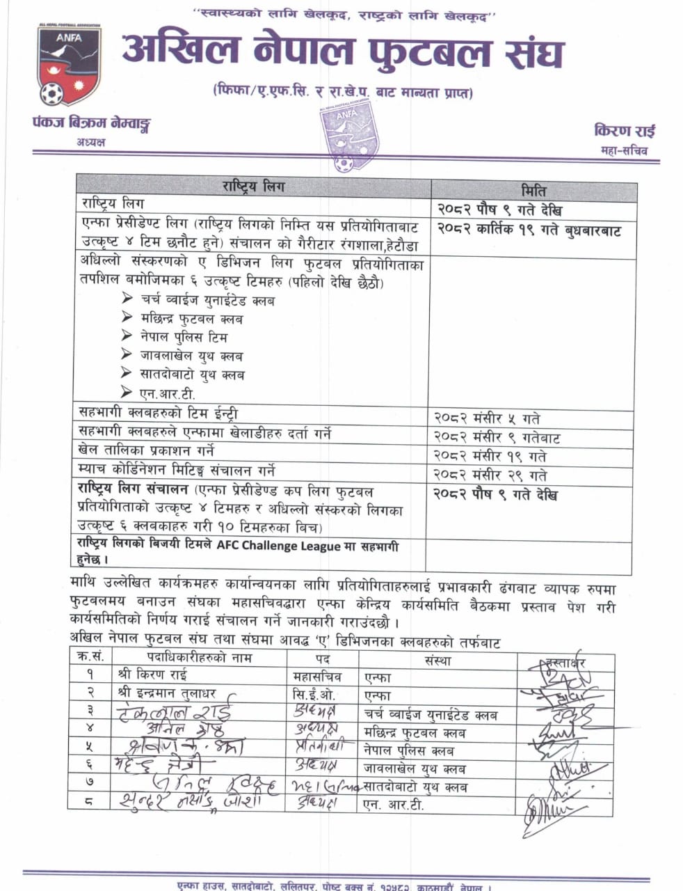 साधारण सभाले यो वर्षको पुस ९ गतेबाट ए डिभिजन लिग गर्ने एन्फाको प्रस्तावलाई अनुमोदन गरेको थियो। त्यसलाई कुल्चेर एन्फा र क्लबहरुबीचको आज बसेको बैठकले यो वर्ष राष्ट्रिय लिग गर्ने र ए डिभिजन लिग अर्को वर्ष मात्र आयोजना गर्ने संयुक्त निर्णय गरेका छन्।