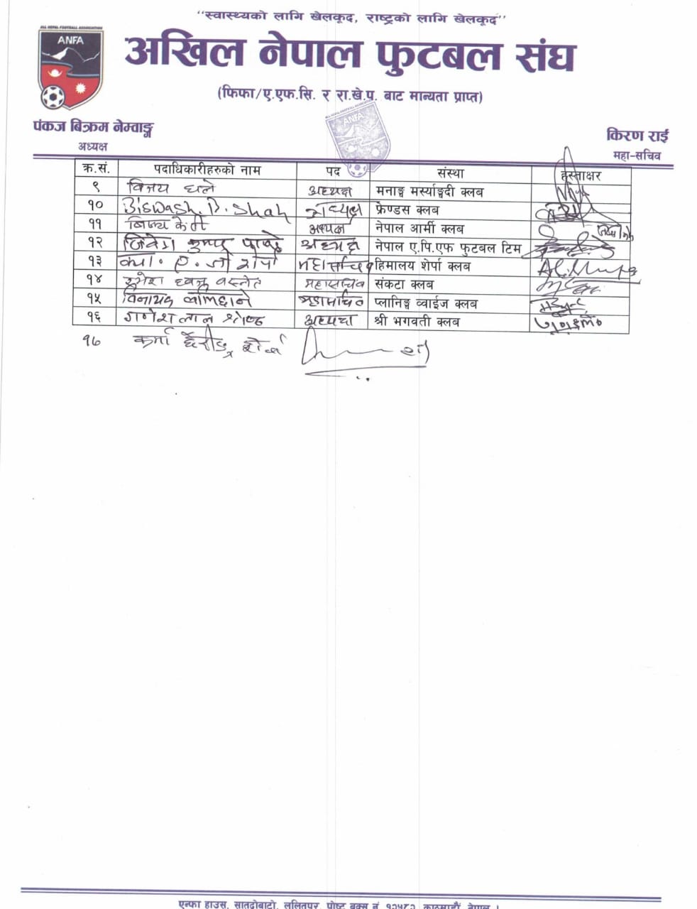 आजको बैठकमा एन्फाका महासचिव किरण राई सिइओ इन्द्रमान तुलाधर तथा १४ टोलीका प्रतिनिधिले राष्ट्रिय लिग र ए डिभिजन लिगको लागि सहमति गर्दै संयुक्त विज्ञप्ति जारी गरेका हुन्। ए डिभिजन लिग पछिल्लो पटक सम्पन्न भएको आज ८ सय ७६ दिन पूरा भएको छ।