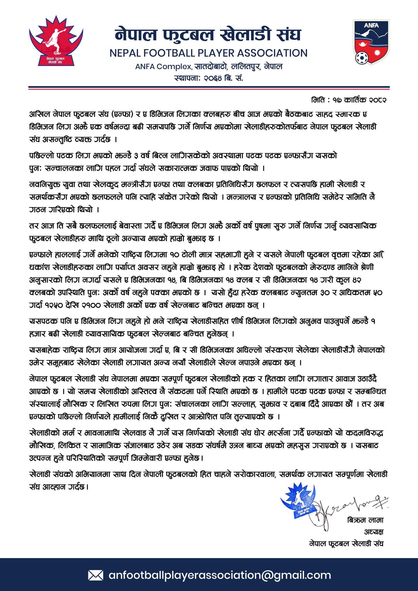 ‘राष्ट्रिय लिग मात्र आयोजना गर्दा ए, बि र सी डिभिजनका अघिल्लो संस्करण खेलेका खेलाडीसँगै नेपालको उमेर समूहबाट खेलेका खेलाडी लगायत अन्य नयाँ खेलाडीले खेल्न नपाउने भएका छन्,’ विज्ञप्तिमा उल्लेख छ, ‘एन्फाको पछिल्लो निर्णयले हामीलाई निकै दुखित र आक्रोशित पनि तुल्याएको छ उल्लेख गर्दै संघले भनेको छ , खेलाडीको मर्म र भावनामाथि खेलवाड नै गर्ने यस निर्णयको खेलाडी संघ घोर भर्त्सना गर्दै एन्फा र क्लबहरुको यो कदमविरुद्ध मौखिक, लिखित र सामाजिक संजालबाट उठेर अब सडक संघर्षमै उत्रन बाध्य भएको महसुस गराएको छ । यसबाट उत्पन्न हुने परिस्थितिको सम्पूर्ण जिम्मेवारी एन्फा हुनेछ।’