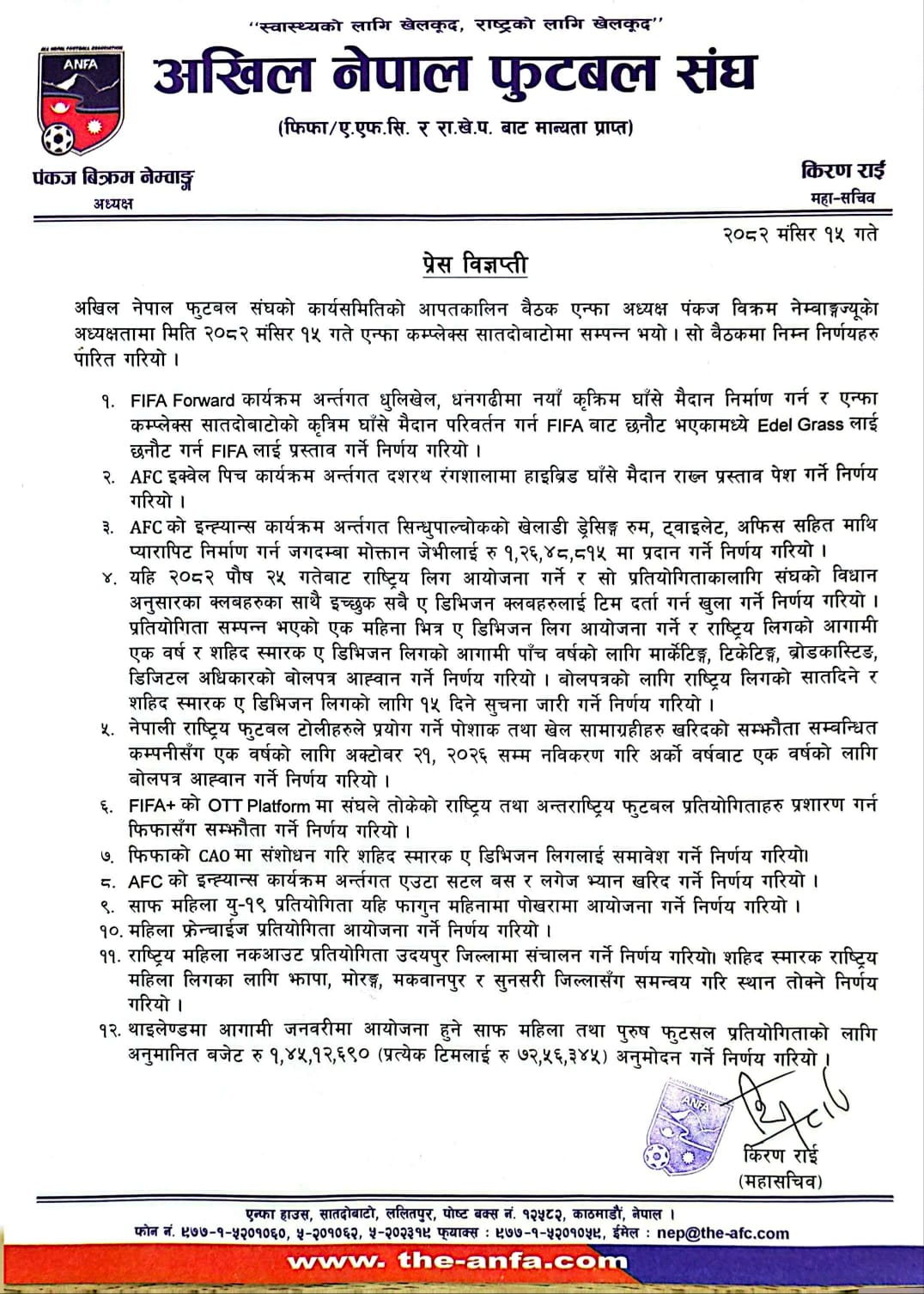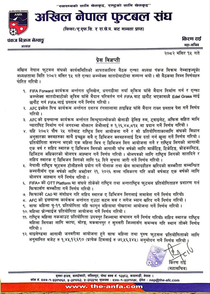यसैगरी फिफा फर्वाड कार्यक्रम अन्तर्गत धुलिखेल, धनगढीमा नयाँ कृत्रिम घाँसे मैदान निर्माण गर्न र एन्फा कम्प्लेक्स सातदोबाटोको कृत्रिम घाँसे मैदान परिवर्तन गर्न ‘इडेल ग्रास’ फिफालाई प्रस्ताव गर्ने तथा एएफसी इक्वेल पिच कार्यक्रम अन्तर्गत दशरथ रंगशालामा हाइब्रिड घाँसे मैदान राख्न प्रस्ताव पेश गर्ने निर्णय पनि भएको एन्फाको प्रेस विज्ञप्तिमा उल्लेख छ। बैठकले विभिन्न १२ निर्णय गरेको छ।
