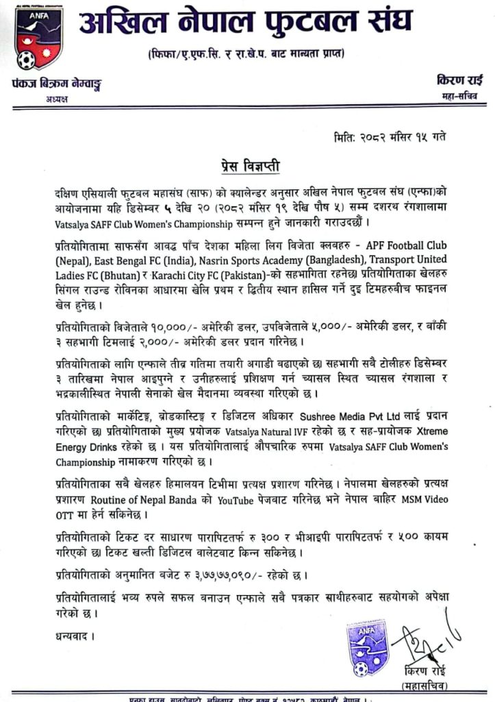 बैठकले थाइल्याण्डमा आगामी जनवरीमा हुने साफ महिला तथा पुरुष फुटसल प्रतियोगिताका लागि बजेट अनुमोदन गर्ने निर्णय पनि गरेको छ।