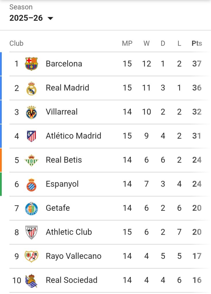 ला लिगा अंक तालिकाका शीर्ष १० टोली