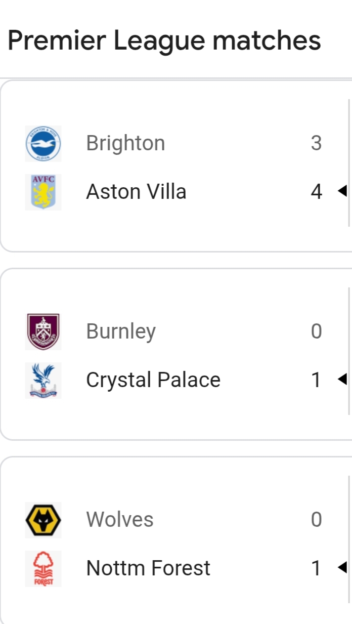 अन्य खेलमा एस्टन भिल्लाले ब्राइटनलाई ४-३ ले, क्रिस्टल प्यालेसले बर्नली तथा नटिङघम फरेस्टले वल्भ्सलाई समान १-० ले हराएको छ।