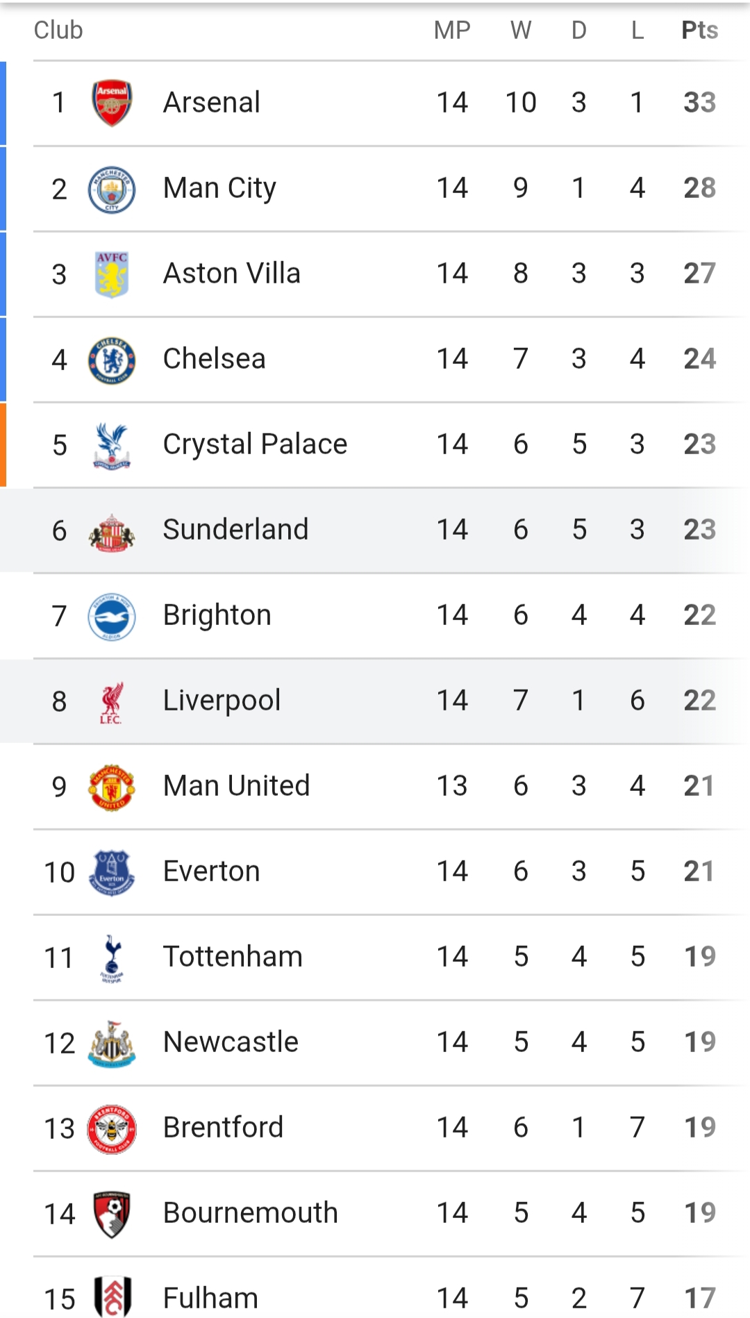 यो जितसँगै आर्सनल (३३ अंक) शीर्षस्थानमा थप मजबुत बनेको छ। ब्रेन्टफोर्ड हारपछि एक स्थान झर्दै तालिकाको १३औँ स्थानमा पुगेको छ।