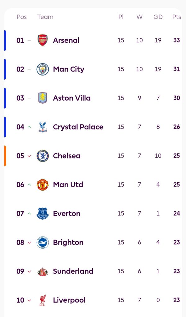प्रिमियर लिग अंकतालिकाको शीर्ष १० टोली