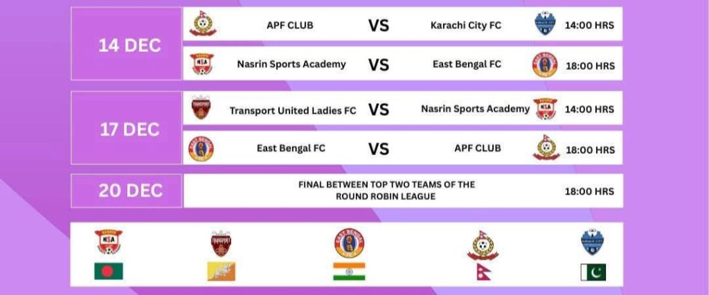 आइतवार एपिएफले कराँचीसँग तथा नसरिन स्पोर्ट्स एकेडेमीले इस्ट बंगालसँग प्रतिस्पर्धा गर्नेछ। दक्षिण एसियाका ५ राष्ट्रको लिग च्याम्पियनको सहभागिता रहेको च्याम्पियन्सिपमा सिंगल राउन्ड रोबिनका आधारमा जारी छ । शीर्ष २ टोलीेले फाइनल खेल्नेछन् ।
