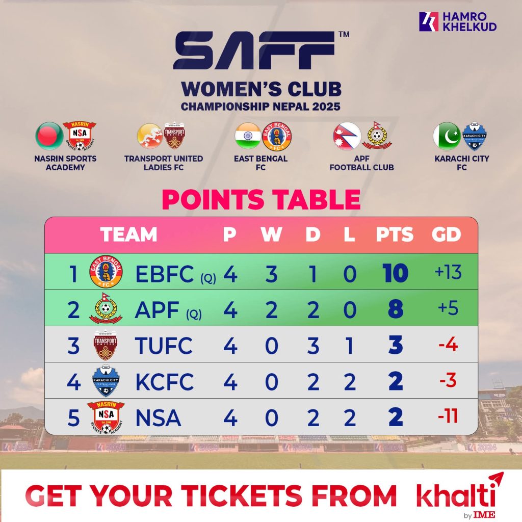 काठमाडौं (हाम्रो खेलकुद)- एपिएफ र भारतको इस्ट बंगाल एफसीबीचको साफ महिला क्लब च्याम्पियनसिपको समूह चरणमा अन्तिम खेल बराबरीमा टुंगिएको छ।