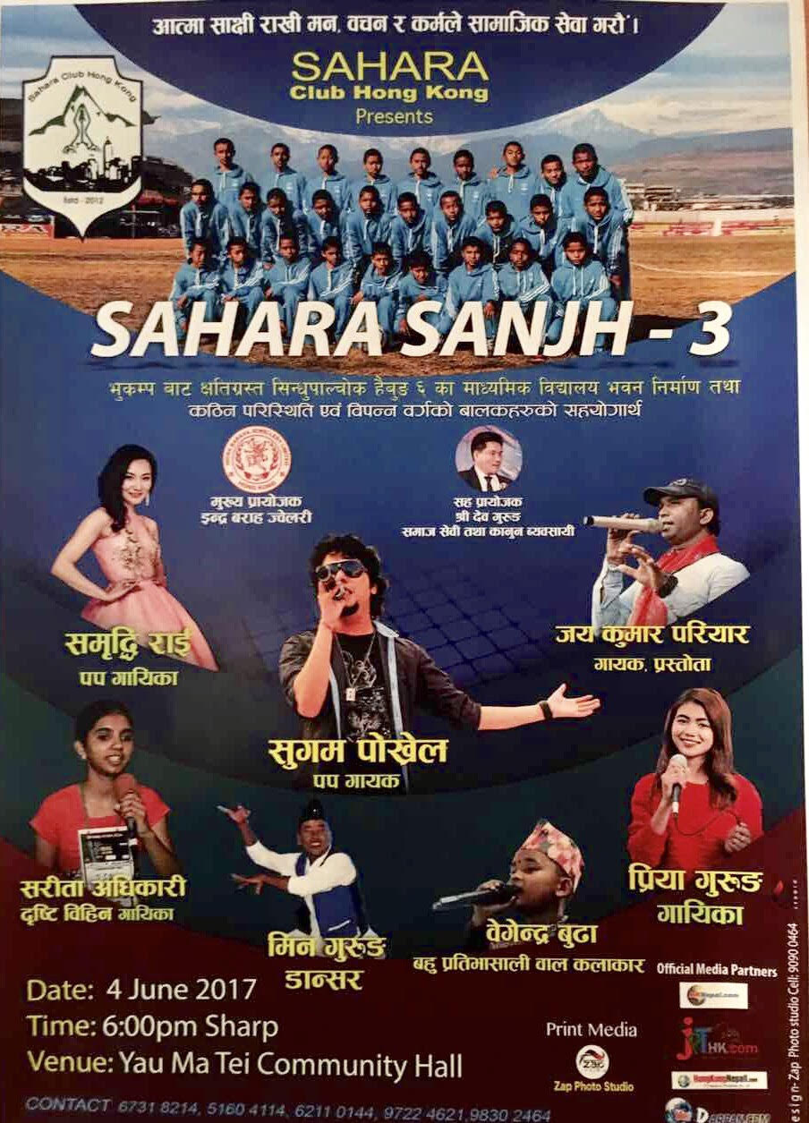 पोखरा १ (हाम्रो खेलकुद)– पोखराको सहारा एकेडेमिको सहयोगार्थ हङकङमा यसै बर्ष पनि सहारा साँझ हुने भएको छ । एकेडेमिको सहयोगार्थ सहित भूकम्पबाट क्षेतिग्रस्त सिन्धुपाल्चोक हैबुङ को माध्यामिक बिद्यालयको भवन निमार्णको लागि तेश्रो संस्करणको सहारा साँझ आगामी जेठ २१ गते कार्यक्रम आयोजना हुने भएको सहारा हङकङले जनाएको छ ।