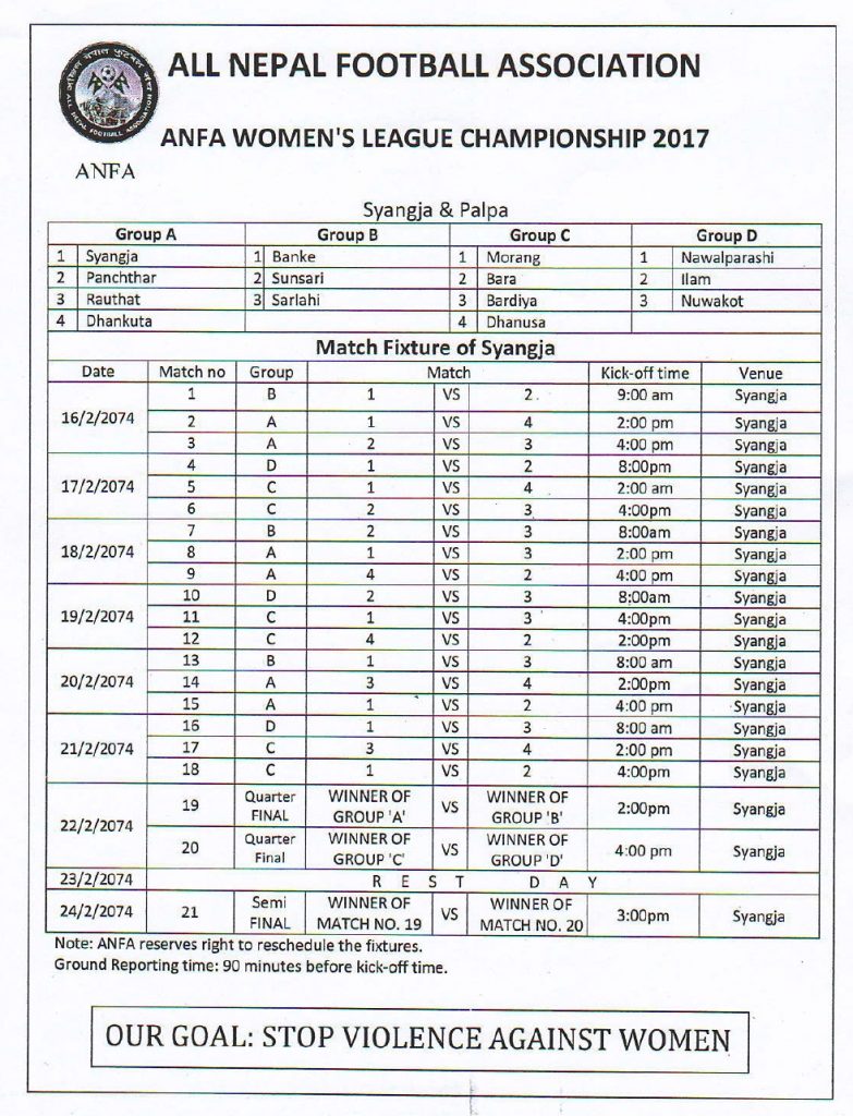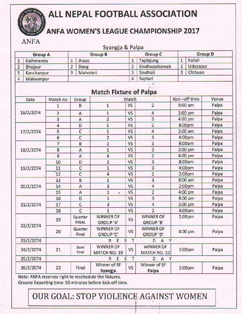 जेठ १६ गतेबाट सुरु हुने यस प्रतियोगिताका खेलहरु पाल्पा र स्याङ्जामा खेलिनेछ। उक्त प्रतियोगितामा एन्फासँग आबद्ध विभिन्न २८ जिल्लालाई कुल ८ समुहमा विभाजन गरेर च्याम्पियनसिपका ४ समुहगत खेल पाल्पामा र बाँकी ४ स्याङ्जामा खेलाइनेछ। हरेक समूहमा शीर्ष एक टोलीले मात्र क्वार्टरफाइनलमा प्रवेश पाउनेछ । प्रतियोगिताको फाइनल खेल जेठ २७ गते पाल्पामा खेलिनेछ।