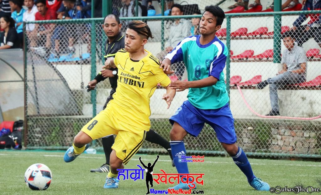 पछिल्लो संस्करणको उपविजेता टोली लुम्बिनीले खेलको २६औं मिनेटमा अजित थापा गोलसँगै अग्रता लिएको थियो। एनआरटिमाथि खेलभर हावी रहेको लुम्बीनीले पटक पटक आक्रमणको जालो बुनेपनी गोलरक्षक सन्देश गुरुङ त्यसको बाधक बनेका थिए। पछिल्लो संस्करणमा लुम्बिनीकै जर्सी पहिरिएका सन्देश यो पटक भने कप्तान अशोक थापासँगै एनआरटिमा होमिएका छन्।