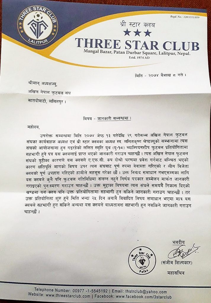 थ्रीस्टार क्लबले एन्फालाई पठाएको पत्र