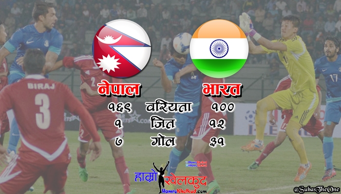 यसैगरी नेपाल र भारतबिचको पछिल्लो अन्तर्राष्ट्रिय खेलमा भारत ४-१ले विजयी भएको थियो। सन २०१५को डिसेम्बर महिनामा साफ च्याम्पियनसिपमा भएको खेलमा नेपालले बिमल घर्ति मगरको गोलमा अग्रता लिएपनि ४ गोल खाएको थियो।