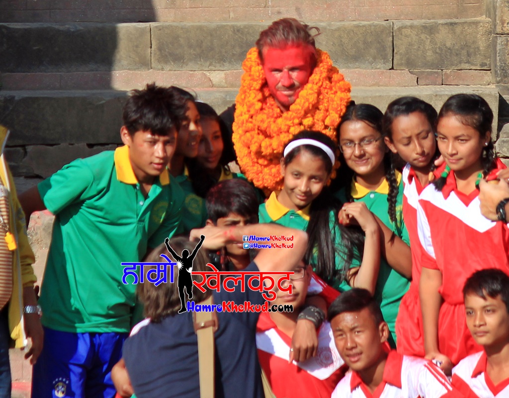 विमानस्थलमा करिब २५० समर्थक जम्मा भएकोमा भक्तपुर पुग्दा हजारौंको संख्यामा मानिसहरुको उपस्थिति थियो| भिडलाई व्यवस्थित पार्न सुरक्षा व्यवस्था कडा भएतापनि हम्मे हम्मे परेको थियो| विद्यालयको कार्येक्रम सकियेलगतै उनि तौमडी स्थित न्यातपोल मन्दिरको परिसरमा पुगे| त्यहाँ उनले बाक्लो सुरक्षा घेराकाबीच पद्म्म माविका विधार्थीसँग फुटबल खेले । युनिसेफको सेभेन अन्तर्गत ७ दिनमा ७ भिन्न देशहरुमा फुटबल खेलेको छायाकंन गर्ने सिलसिलामा बेकह्याम नेपाल आएका हुन् । बेकह्यामलाई हेर्न हजारौं सर्वसाधारण भक्तपुर दरबार स्क्वार पुगेका थिए । सेभेन -अ-साइड फर्म्याटमा खेलिएको खेलमा पद्म स्कुलकै बच्चाहरुले भाग लिएका थिए| दुवै टोलीमा छात्र र छात्रा समावेश गरिएका थिए|