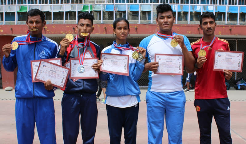 नवौं राष्ट्रपति रनिङ सिल्डमा कीर्तिमान रचेका चार छात्रा खेलाडी बायाँबाट प्रकाश दनुवार, भुवन महतो, निशान गुरुङ र अजितकुमार यादव पदकसाथ । साथमा ट्रिपल जम्पकी स्वर्ण विजेता विपना परियार (बीच) । तस्बिर-राखेप