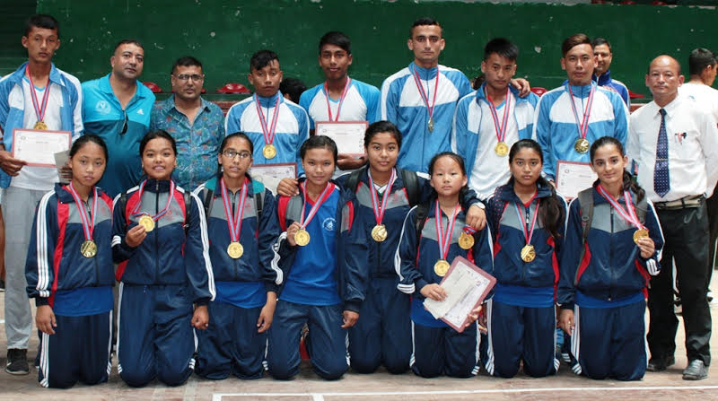 नवौं राष्ट्रपति रनिङ सिल्डको छात्र/छात्रा भलिबल उपाधि विजेता मध्यमाञ्चल र पश्चिमाञ्चल टोली । तस्बिर- राखेप