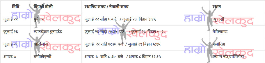 बार्सिलोना (एजेन्सी) – बार्सिलोनाले अमेरिकामा इन्टरनेसनल च्याम्पियन्स कपमा युभेन्सटको सामना गरेर यस सिजनको प्रि-सिजन खेलको सुरुवात गर्नेछ। पहिलो खेलमा युभेन्टसपछि दोस्रो खेलमा बार्साले म्यानचेस्टर युनाइटेडको सामना गर्ने छ भने प्रतियोगिताको अन्तिम खेलमा चिर परिचित प्रतिद्वन्द्वी रियल म्याड्रिडको सामना गर्नेछ ।
