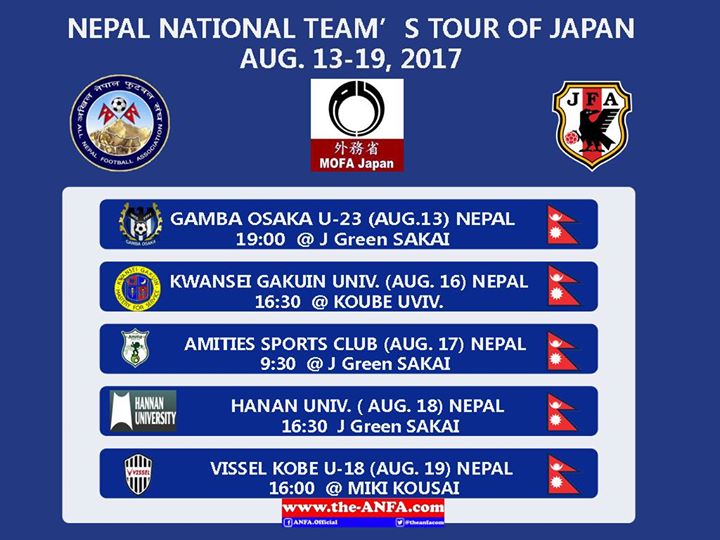 नेपालले गाम्बा ओसाका यू २३ सँग खेल्दै जापानको मैत्रीपूर्ण खेलको यात्रा सुरु गर्नेछ । साउन ३२ देखि टोलीले लगातार ३ गते सम्म चार खेल खेल्ने छ । एन्फाका अनुसार नेपालले साउन ३२ मा क्वान्सी ग्वाक्विन विश्वविद्यालय, भदौ १ मा अमिट्सि स्पोर्टस क्लब, भदौ २ मा हनाम विश्वविद्यालय र भदौ ३ गते भिसेल कोबे यू १८ सँग प्रतिस्पर्धा गर्नेछ ।