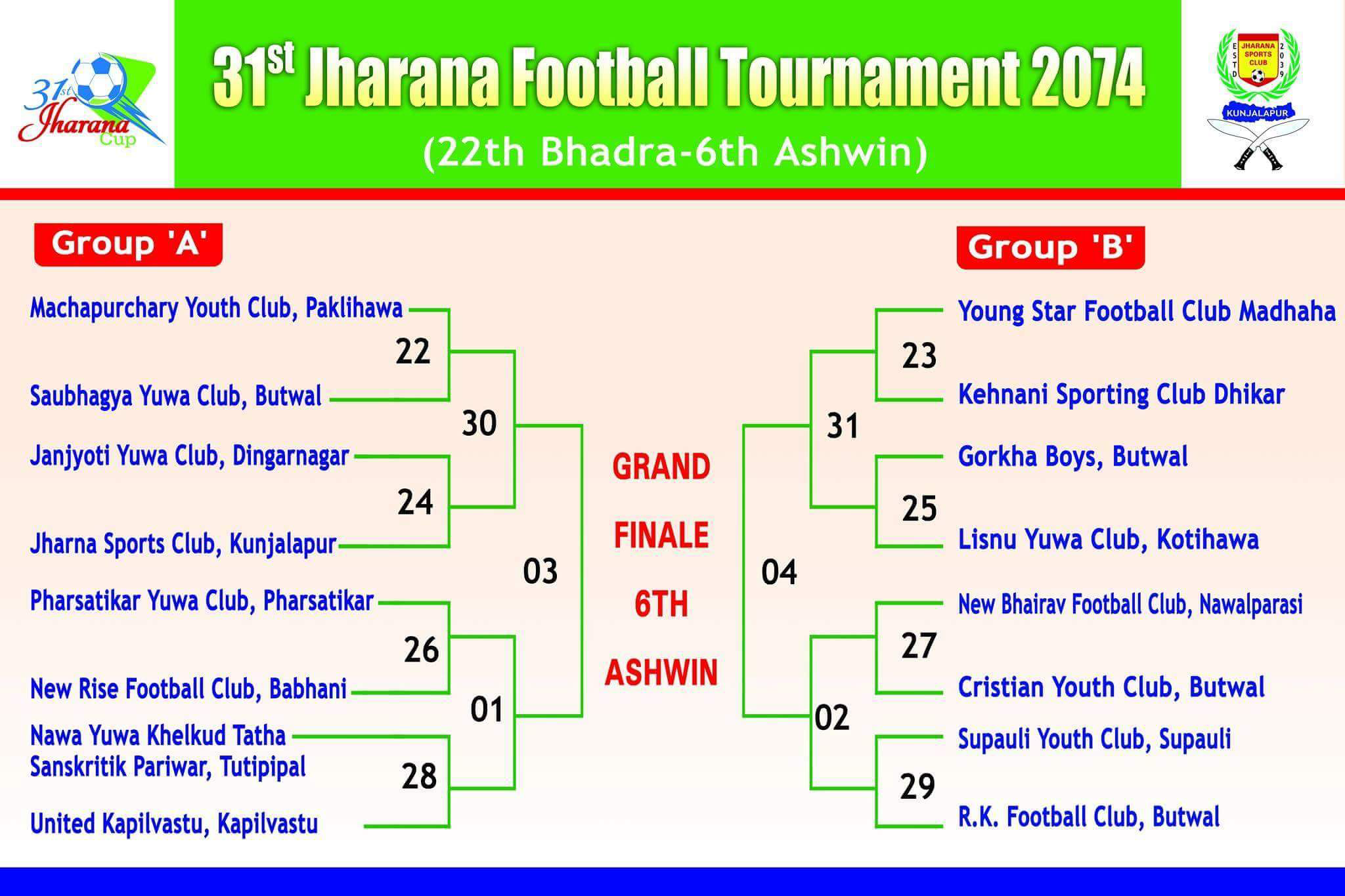 बुटबल– झरना स्पोर्टस क्लबको आयोजनामा ३१ औं झरना रनिङ शिल्ड नकआउट फुटबल प्रतियोगिता बिहीबार सुरु हुँदैछ । तिलोत्तमा नगरपालिका ६ कुञ्जलापुरमा हुने प्रतियोगितामा १६ टोलीको सहभागिता रहने क्लबका अध्यक्ष लोक पुनले जानकारी दिए ।