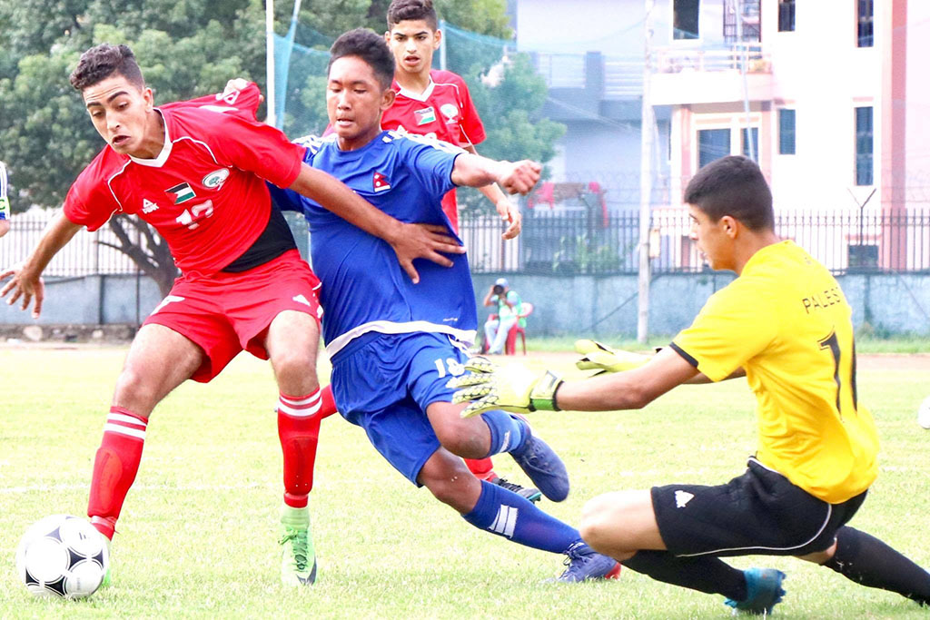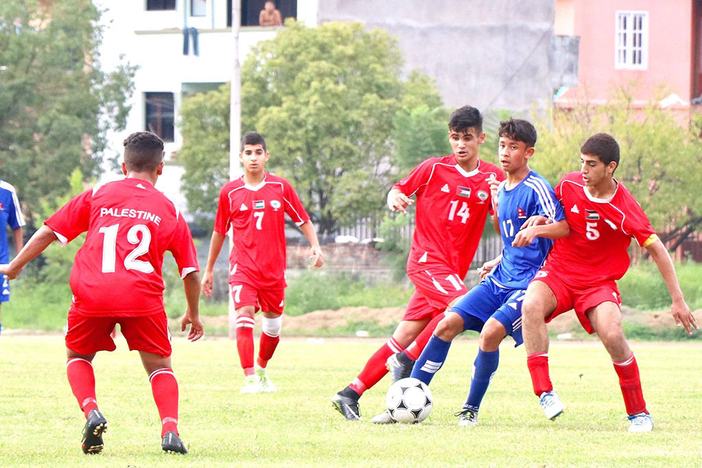 त्यस्तै खेलको २८ औँ मिनेटमा मिडफिल्डबाट आएको पास सदुपयोग गर्दै प्यालेस्टाइनका महमोद रिदातले गोलकिपर विशाल सुनारलाई छक्याई गोल गर्दै खेल बराबरी बनाएका थिए । सो गोल प्यालेस्टाइनको यस प्रतियोगितामा पहिलो गोल थियो । पहिलो हाफमा दुवै टोली खुलेर खेल्दै थुप्रै अवसरहरु सिर्जना गरेका थिए ।