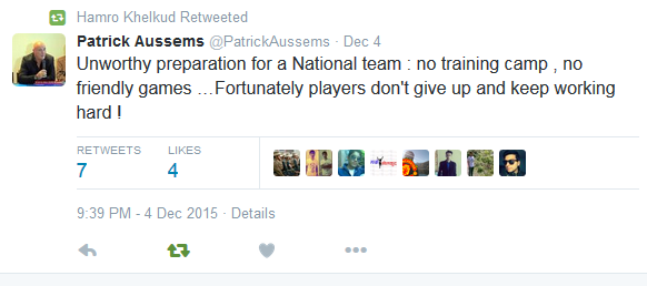 आफ्नो सामाजिक संजाल ट्वीटर मार्फत अभिव्यक्ति व्यक्त गर्दै ओजेम्सले प्रशिक्षणको व्यवस्थापन एकदमै कम्जोर भएको जनाएका छन्| उनले हाल भइरहेको तयारीलाई राष्ट्रिय टोलीको लागि अयोग्य भएको बताएका छन्| प्रतियोगिता आउन तेह्र दिनमात्र बाँकी हुँदापनि हालसम्म राष्ट्रिय टोलीलाई बन्द प्रशिक्षणमा राखिएको छैन| प्रशिक्षक ओजेम्सले बन्द प्रशिक्षण नराखेकोमा आफु दुखित भएको औंल्याएका छन्|