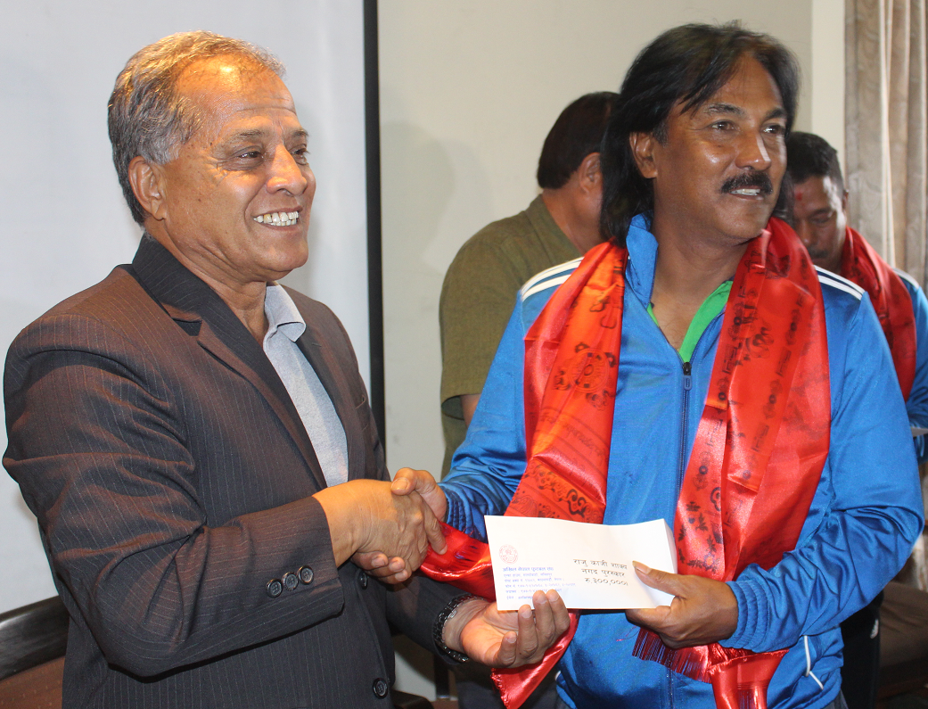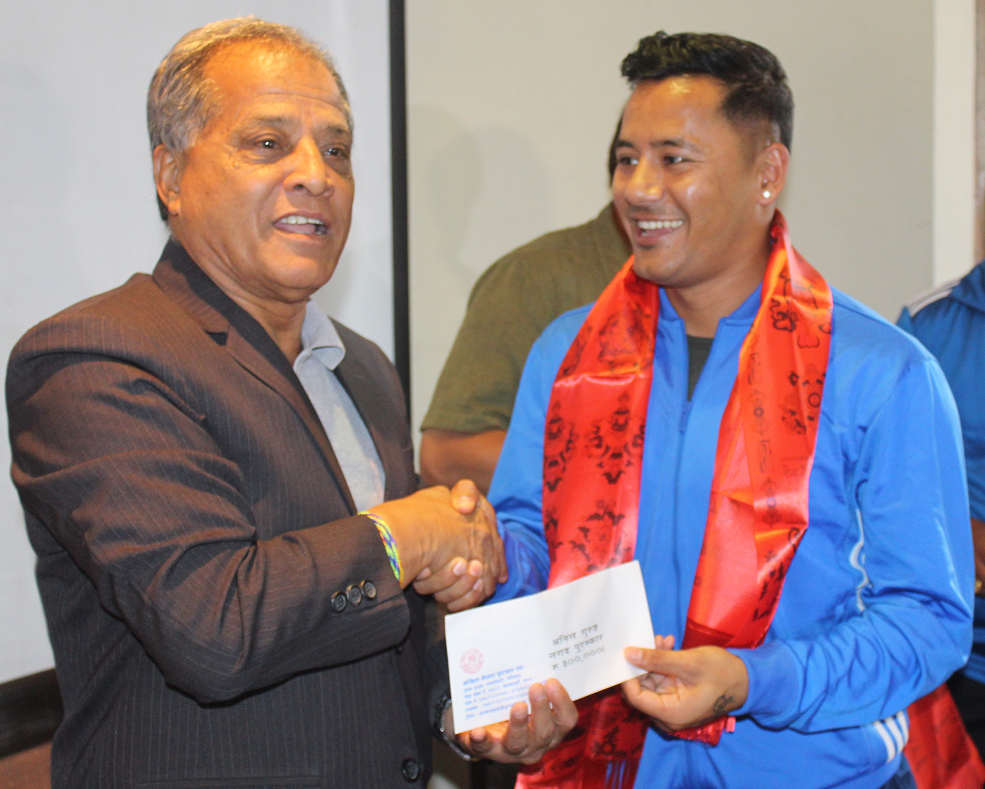 काठमाडौं (हाम्रो खेलकुद)– एएफसी सोलिडारिटी कप विजेता टोलीका खेलाडीलाई अखिल नेपाल फुटबल संघले आज नगद पुरस्कार वितरण गरेको छ । एन्फा कम्प्लेक्स सातदोबाटोमा आयोजित कार्यक्रममा एन्फा अध्यक्ष नरेन्द्र श्रेष्ठले टोलीका सदस्यहरुलाई जनही ३ लाख रुपैयाँ वितरण गरेका हुन् ।
