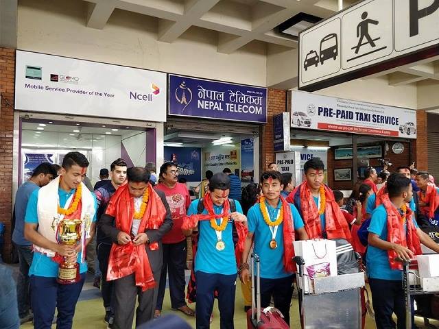 काठमाडौं (हाम्रो खेलकुद) – साफ यू १८ च्याम्पियनसिप विजेता टोली आज स्वदेश फर्केको छ । अखिल नेपाल फुटबल संघ (एन्फा) पदाधिकारीले च्याम्पियन युवा टोलीलाई त्रिभुवन अन्तर्राष्ट्रिय विमानस्थलमा स्वागत गरेका थिए ।