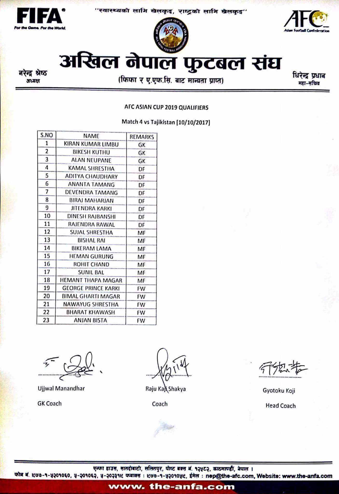 ताजकिस्तानविरुद्धको २३ र त्यसअघि प्रशिक्षणमा रहेका खेलाडीलाई प्रशिक्षणमा सामेल गरेको छ । त्यसमध्ये अनिल गुरुङ भने प्रशिक्षणमा सामेल भएका छैनन् ।अघिल्लो महिना ताजकिस्तानविरुद्धको टोलीमा रहेका २३ र त्यसअघि प्रशिक्षणमा रहेका खेलाडीलाई समेत गरि यसपटक २९ खेलाडीलाई प्रशिक्षणमा सामेल गरिएको थियो । चोटका कारण अनिल गुरुङ भने प्रशिक्षणमा सामेल भएका थिएनन् ।