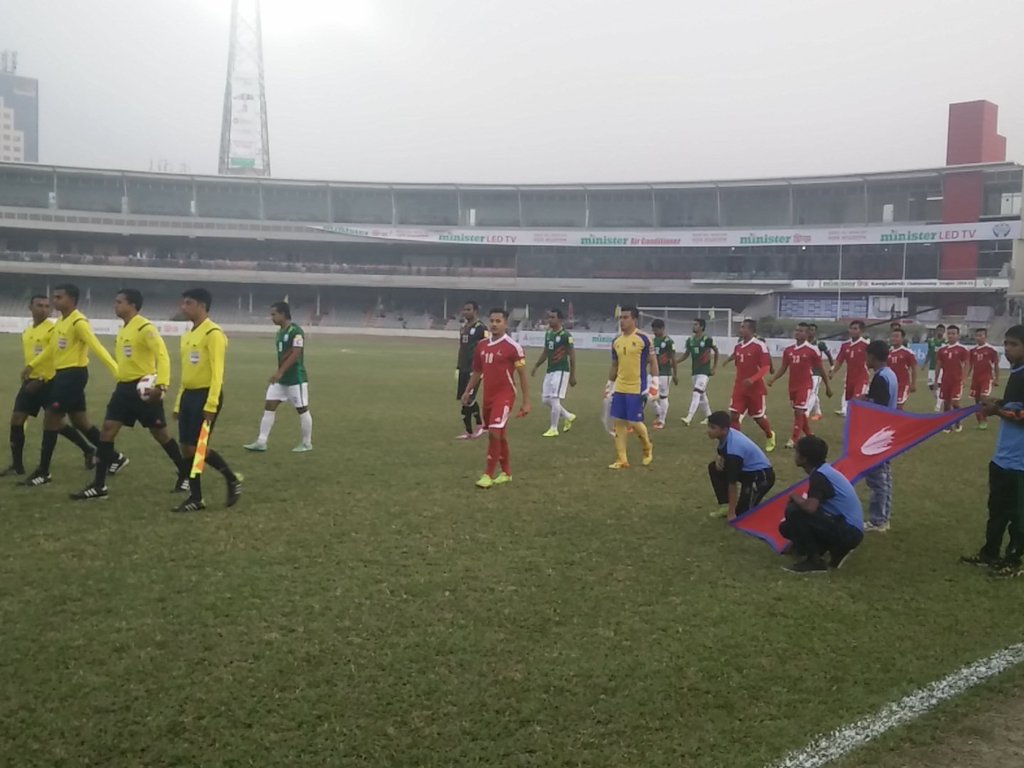 १’ खेल सुरु, नेपालका खेलाडी रातो रङको र बाङ्लादेशका खेलाडी हरियो रङको जर्सिमा प्रस्तुत भएका छन ।