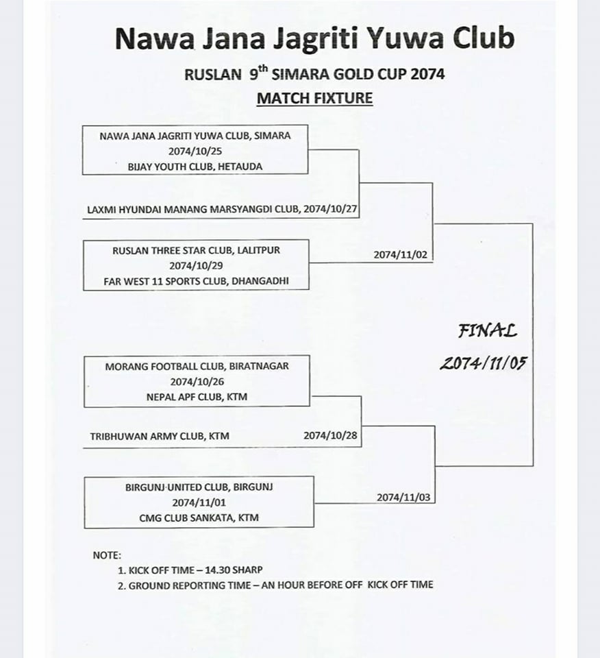 काठमाडौं (हाम्रो खेलकुद) – रुस्लान सिमरा गोल्ड कपको नवौं संस्करणको खेल तालिका सार्वजनिक भएको छ । माघ २५ गते बाट सुरु हुने प्रतियोगितामा १० टोलीको सहभागिता रहने छ । यस वर्ष राखेप च्याम्पियनसिप र १६ औं आहा-रारा गोल्ड कपको विजेता नेपाल पुलिस क्लबले भने यस प्रतियोगितामा सहभागिता नजनाउने भएको छ ।