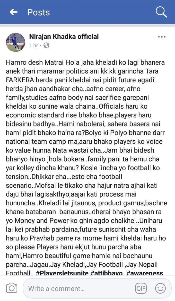 खेलाडीलाई जिताउनुस्, प्रोडकट गर्नुस्, बाँच्ने खाने वातावरण बनाउनुस । धेरै भयो भाषण र यो पैसा र पावरको चलखेल । उनीहरुले केही प्रभाव पार्ने वातावरण बनाउनुस् । भविष्य सुनिश्चित छ उनीहरुको । प्रभावमा पर्ने र मर्ने त खेलाडी नै हुन् । सो प्लिज खेलाडीहरु एकजुट हुनुपर्छ अब हामी, हाम्रो ब्युटिफुल गेम हामीले नै बचाउनुपर्छ । जागौं, जय खेलाडी, जय फुटबल, जय नेपाली फुटबल ।