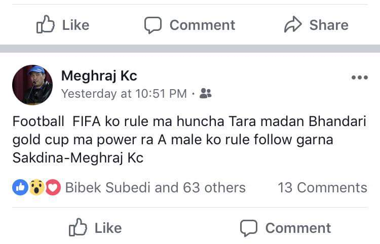 आज थ्री स्टारले बाध्यतावश खेल्नु पर्यो भने त्यो नेपाली खेलकुदको हार हुने थ्री स्टारका प्रशिक्षक केसीले बताए । उनले भने, ‘दबाबमा फुटबल हुन्छ भने त्यो भन्दा लाजमर्दो अर्को कुरा हुन सक्दैन ।’ शनिबार राती केसीले सामाजिक सञ्जाल फेसबुकमा स्टाटस लेखेका थिए, ‘फुटबल फिफाको रुलमा हुन्छ । तर, मदन भण्डारी गोल्डकप मा पावर र एमालेको रुल फलो गर्न सक्दिन ।’