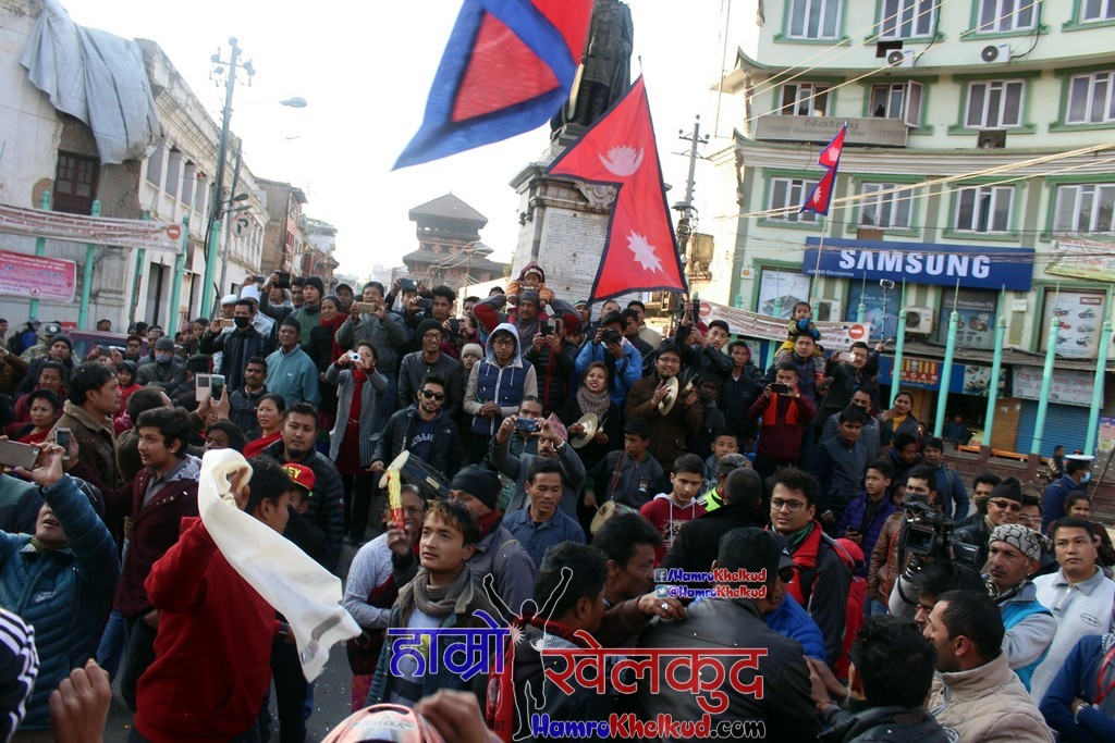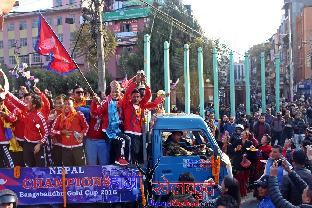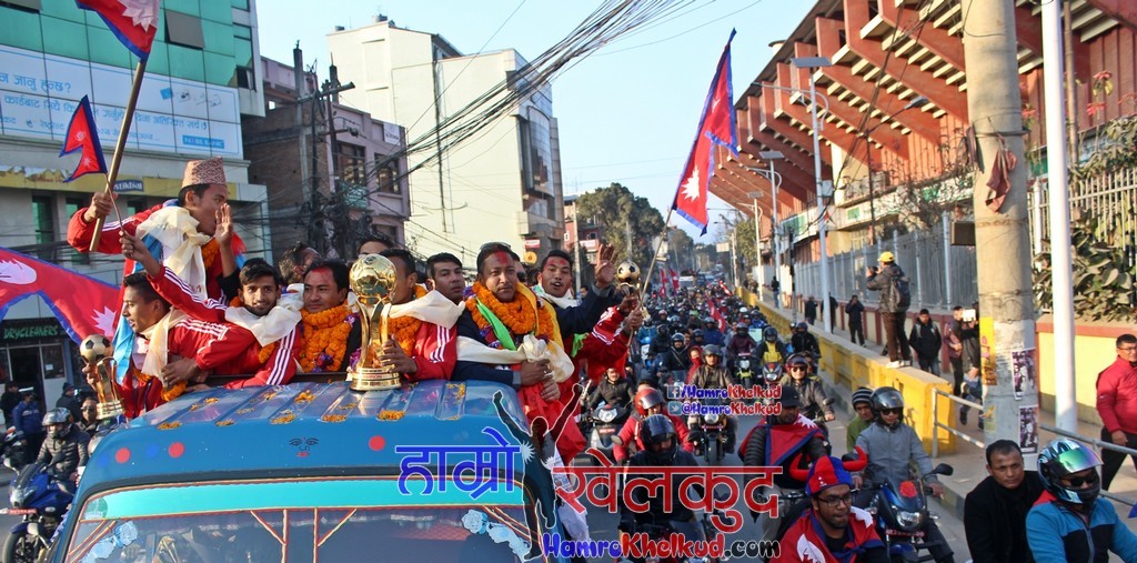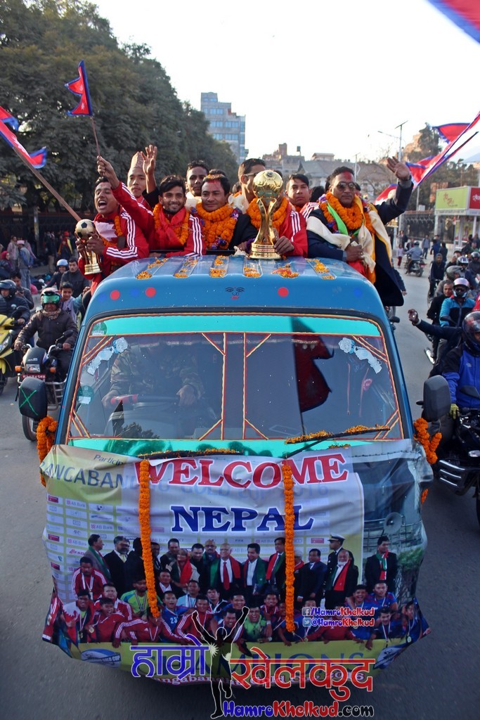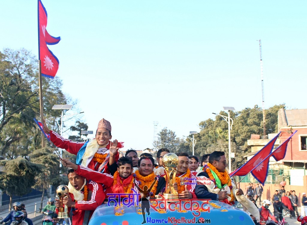 विमानस्थलबाट सुरु भएको परिक्रमा गौशाला, पुरानो बानेश्वोर, मैतिदेवि, पुतलीसडक, प्रदर्शनी मार्ग, भद्रकाली, सुन्धारा, न्युरोड परिक्रमा, रत्नपार्क, सहिदगेट हुदैं रंगशाला गएर टुंगिएको थियो| खेलाडीहरुको स्वागतार्थ विमानस्थल देखि हजारौं समर्थकहरु रंगशाला सम्म पुगेका थिए|