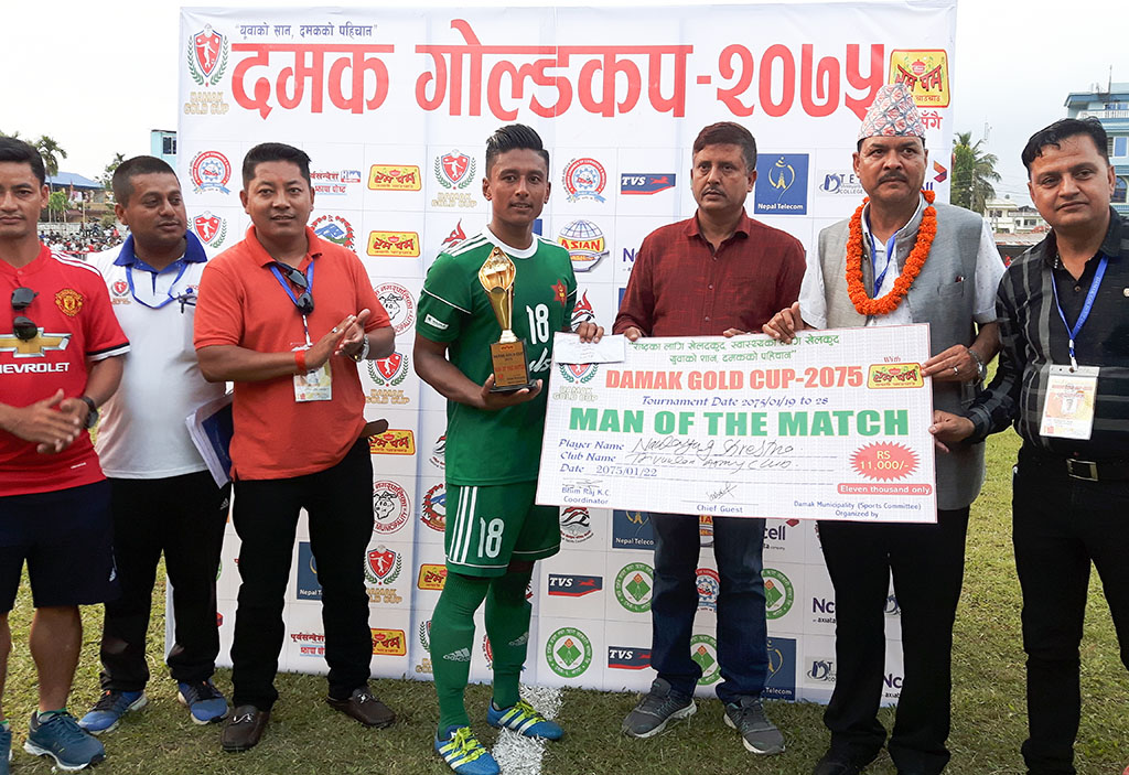 आर्मीका लागि ह्याट्रिक प्रहार गरेका नवयुग श्रेष्ठले कुल ह्याट्रिक प्रहार गरे भने कप्तान भारत खवास र विमल पाण्डेले पनि गोल गरे। नवयुग खेलको ‘म्यान अफ दी म्याच’ चुनिए।