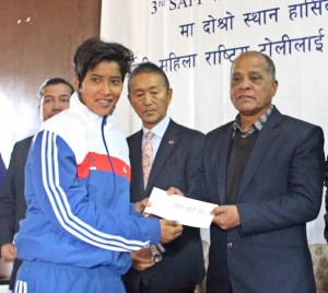 प्रतियोगिता सम्पन्न भएको दुई बर्षपछि साग गेम्स्मा प्रथान गर्नुअघि अखिल नेपाल फुटवल संघ (एन्फा)ले खेलाडीहरुलाई पुरस्कृत गरेको हो । एन्फाका कार्यबाहक अध्यक्ष नरेन्द्र श्रेष्ठले साफ च्याम्पियनसीपमा सहभागी २० खेलाडी र प्रशिक्षक कुमार कटुवाललाईसम्मान गरेको हो ।