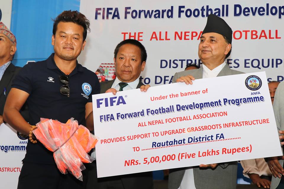 विश्व फुटबलको सर्वाेच्च निकाय फिफाको फुटबल विकास कार्यक्रम अन्र्तगत एन्फाले ग्रासरुट फुटबल गतिविधि बढाउन, मैदानको मर्मत लगायतका कार्यका लागि एन्फासँग आबद्ध ४५ जिल्लामा आर्थिक सहयोग र खेलकुद सामग्री प्रदान गरेको हो । कार्यक्रम अन्तर्गत जिल्ला तहबाटै फुटबल विकासको लागि एन्फाले विविध कार्यक्रमहरु बनाएको छ ।