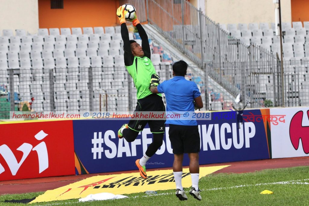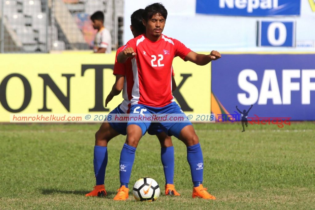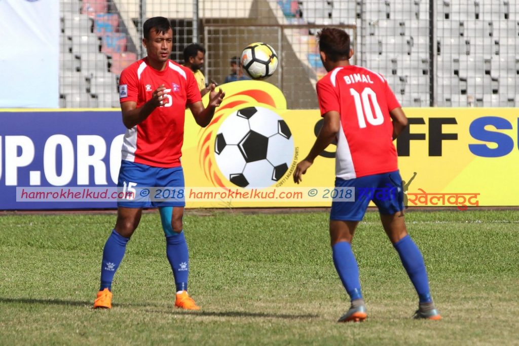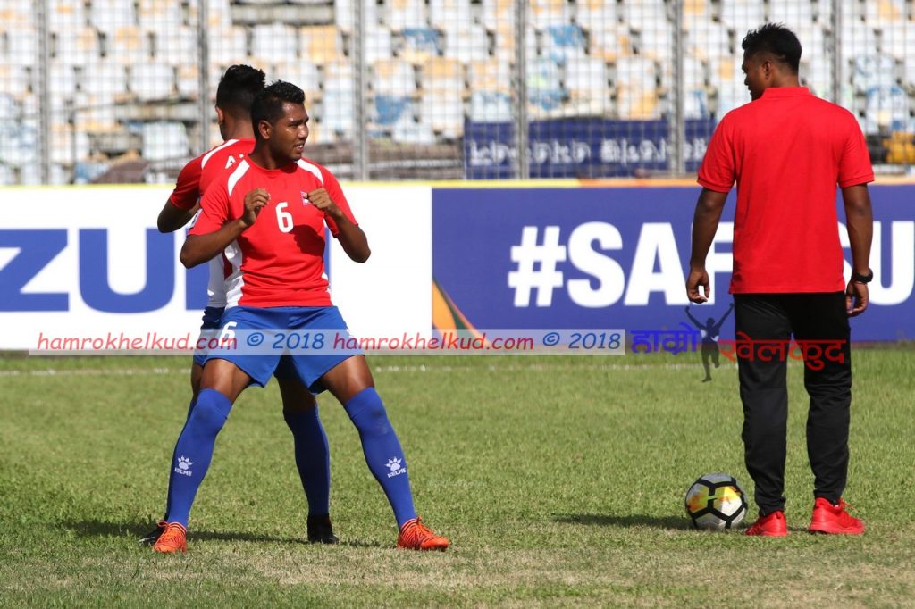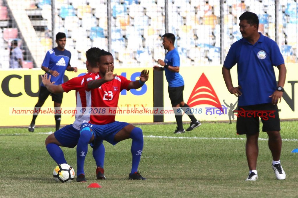 ढाका – साफ च्याम्पियनसिपको समूह चरणको दोस्रो खेलमा आज नेपालले भुटानको सामना गर्दैछ । खेलअघि वार्मअप गर्दै नेपाली टोलीको फोटो फिचर: