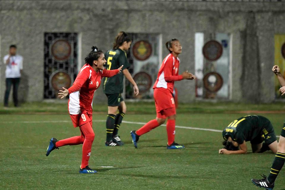 एकपक्षीय खेलमा नेपालले खेलको पाँचौ मिनेटमा रेखा पौडेलको गोलबाट खेलमा अग्रता बनाएको थियो । त्यसपछि १७ र १९ औं मिनेटमा गोल गर्दै ह्याट्रिक पूरा गरेकी थिइन् । त्यसपछि रेखाले ३२ र ३८ औं मिनेटमा गोल गरेपछि आफ्नो गोल सङ्ख्या ५ पु¥याएकी थिइन् । पहिलो हाफको इन्जुरी समयमा कप्तान सरु लिम्बुले गोल गरेपछि नेपाले पहिलो हाफमा ६–० को अग्रता बनाएको थियो ।