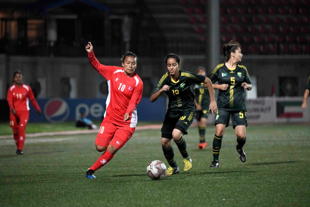 नेपालले पहिलो खेलमा पाकिस्तानलाई १२-० को फराकिलो अन्तरले पराजित गरेको थियो । उक्त खेलमा नेपालका लागि रेखा पौडेल एक्लैले ७ गोल गरेकी थिइन् । अन्य गोल रश्मीकुमारी घिसिङ, मनिषा राउत, मन्जलीकुमारी योन्जन, सरु लिम्बु र एलिसा जिम्बाले गरेका थिए । निकै आक्रामक रणनीतिमा खेलेको नेपालले पहिलो हाफमा नै ६ गोल हानेको थियो ।
