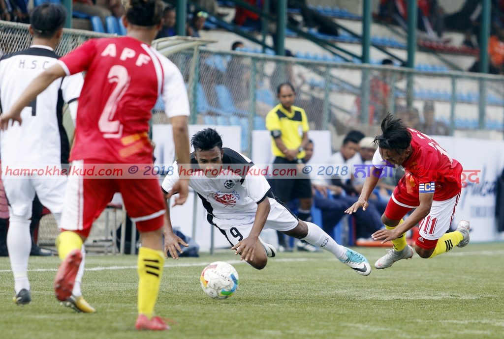 निकै प्रतिस्पर्धात्मक खेलको पहिलो हाफमा दुवै टोलीले गोल गर्ने अवसर चुकाए । १० औं मिनेटमा शेर्पाका अमर डंगोलले फितलो प्रहार गरेलगत्तै एपीएफका युवराज खड्काले पनि गोलरक्षकलाई समस्यामा पर्न सकेनन् । निरज बस्नेतले पेनाल्टीक्षेत्र बाहिर पाएको दुई फ्रिकिकमा कुनै खतरा सिर्जना गर्न सकेनन् । शेर्पाका कर्ण लिम्बू, अमर डंगोल, राज पौडेलको आक्रमणमा तालमेलको कमी देखिएको थियो ।