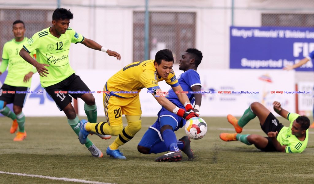 खेलको तेस्रो मिनेटमा अजायी मार्टिन्सको विराज महर्जनले बचाएका थिए । २२ औं मिनेटमा रञ्जित धिमालको फ्रिकिक क्रसबारभन्दा थोरै माथिबाट बाहिरियो । ३६ औं मिनेटमा सुनील बलको क्रसमा विशाल श्रेष्ठले उत्कृष्ट पन्च गरे । पहिलो हाफको ४ मिनेट बाँकी छँदा सुनिल बलको उत्कृष्ट प्रहारलाई विशालले विफल पारिदिए । यसको एक मिनटमै मार्टिन्सले दिएको पासमा बुद्ध चेम्जोङको प्रहारले पोस्टको दिशा लिन सकेन ।